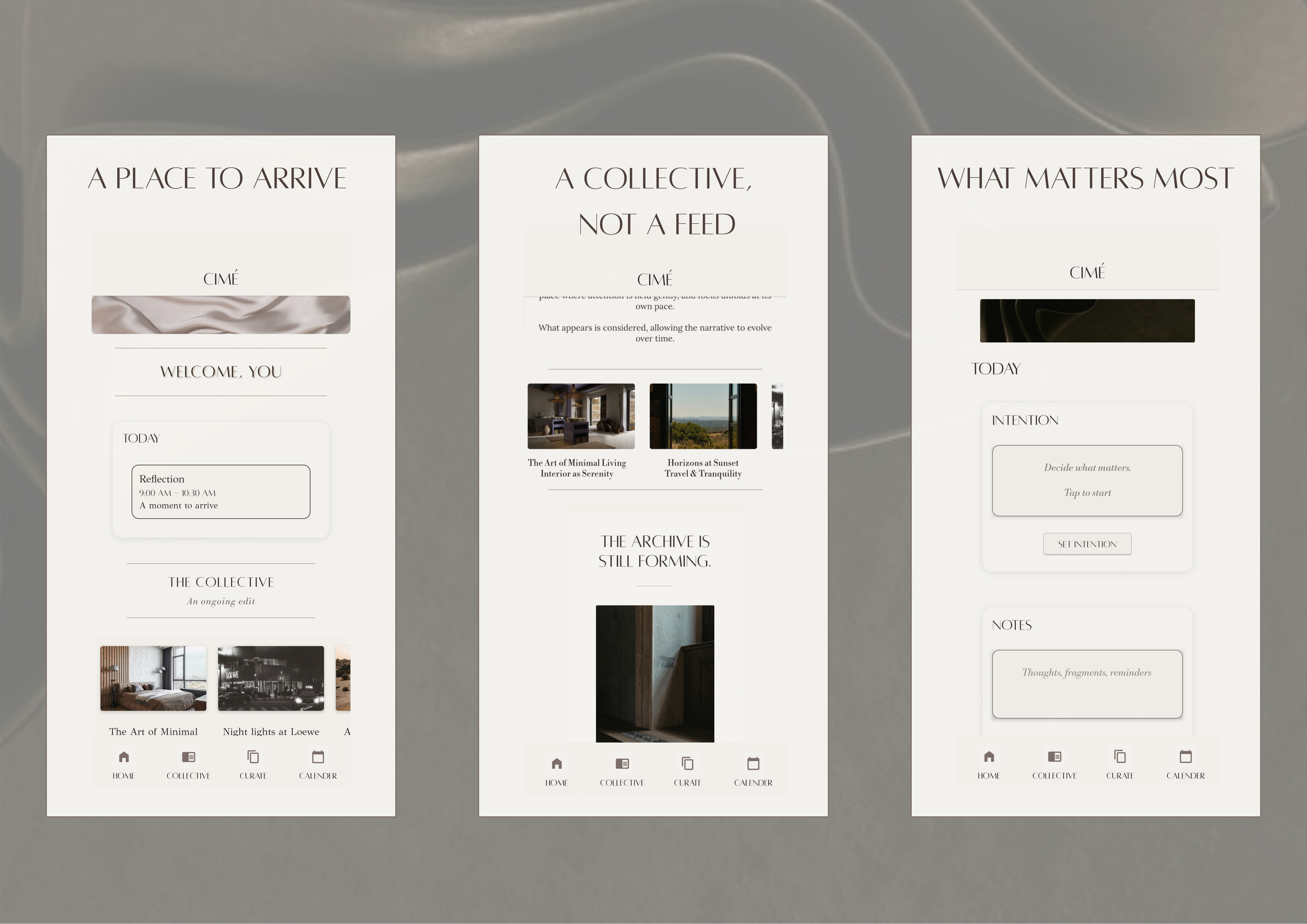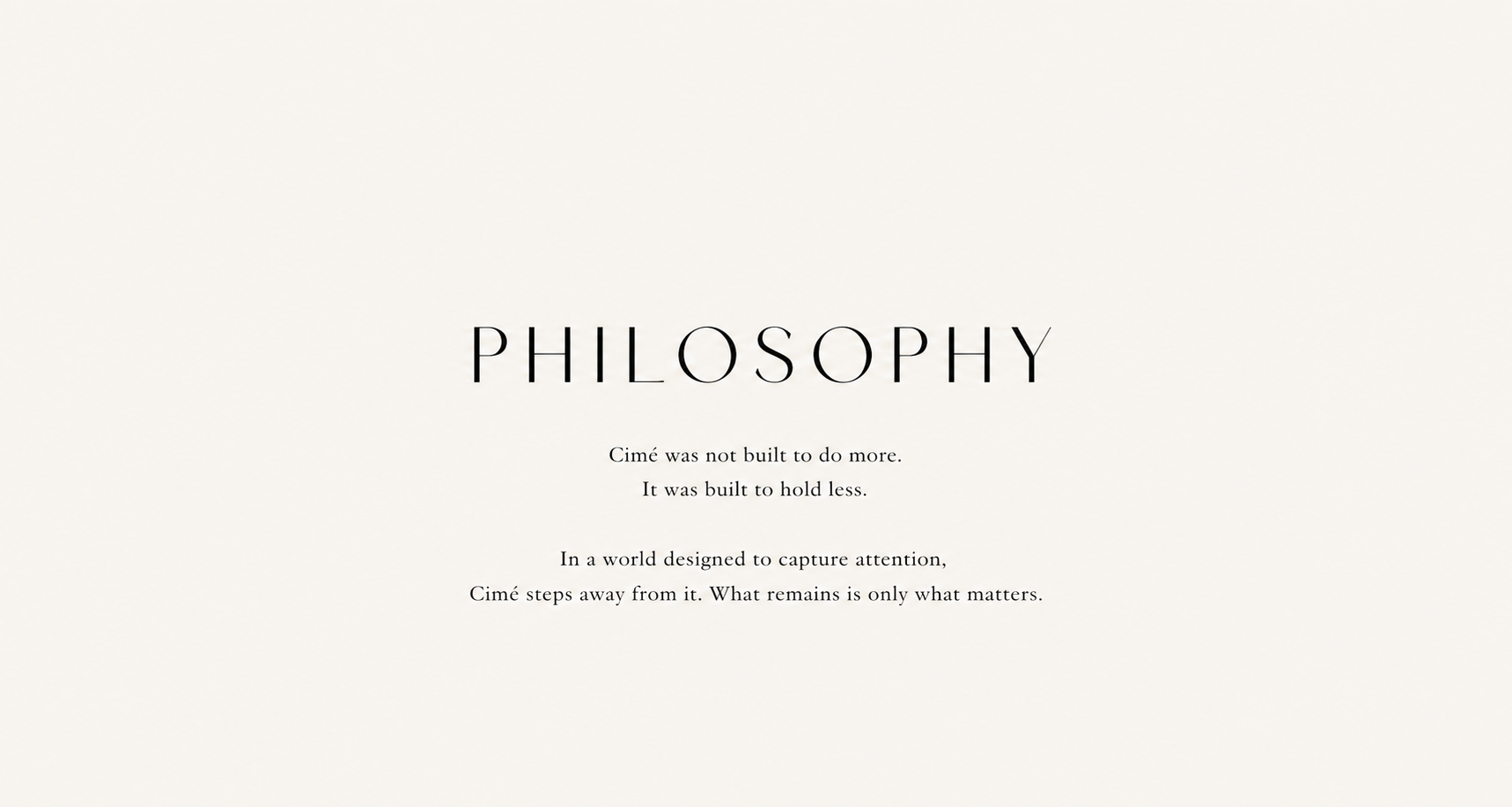 Cimé is a digital space designed for clarity, reflection, and a quieter way of engaging with attention.